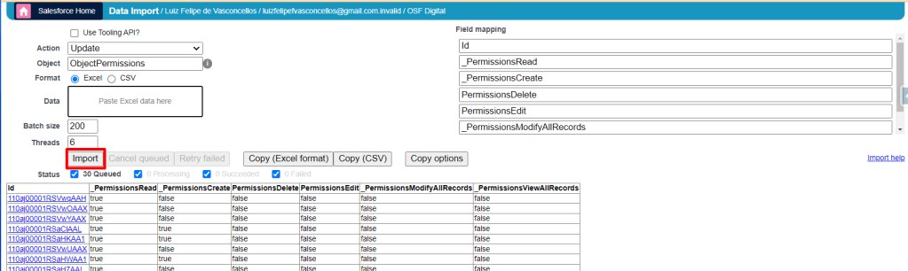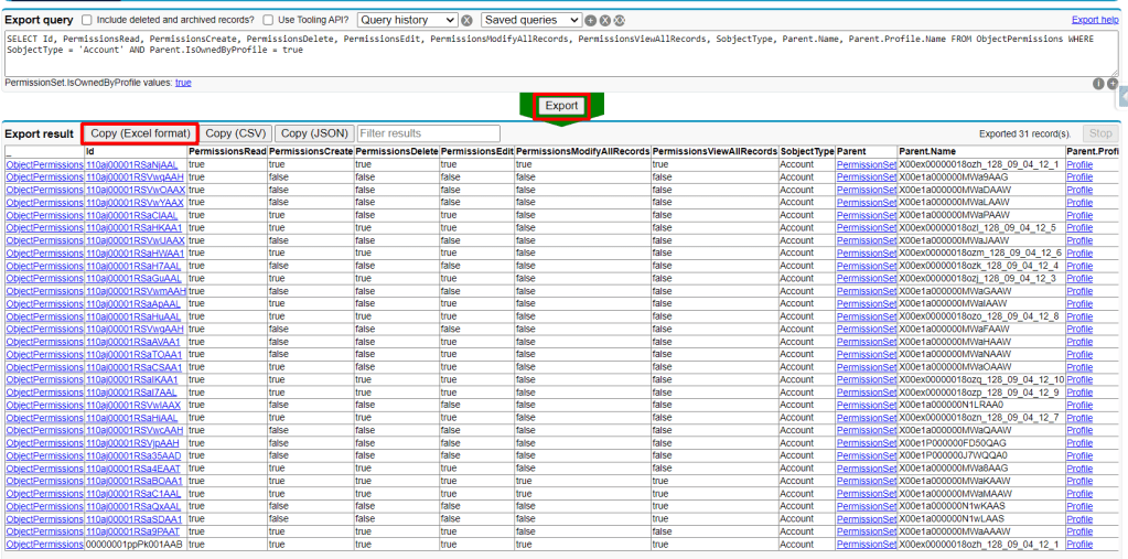 We can also see that each column represents a permission, such as PermissionsRead, PermissionsCreate, PermissionsDelete, PermissionsEdit, PermissionsModifyAllRecords, PermissionsViewAllRecords. Edit each column as needed. To remove a permission, write ‘false’ in the cell corresponding to the profile and the desired permission.
