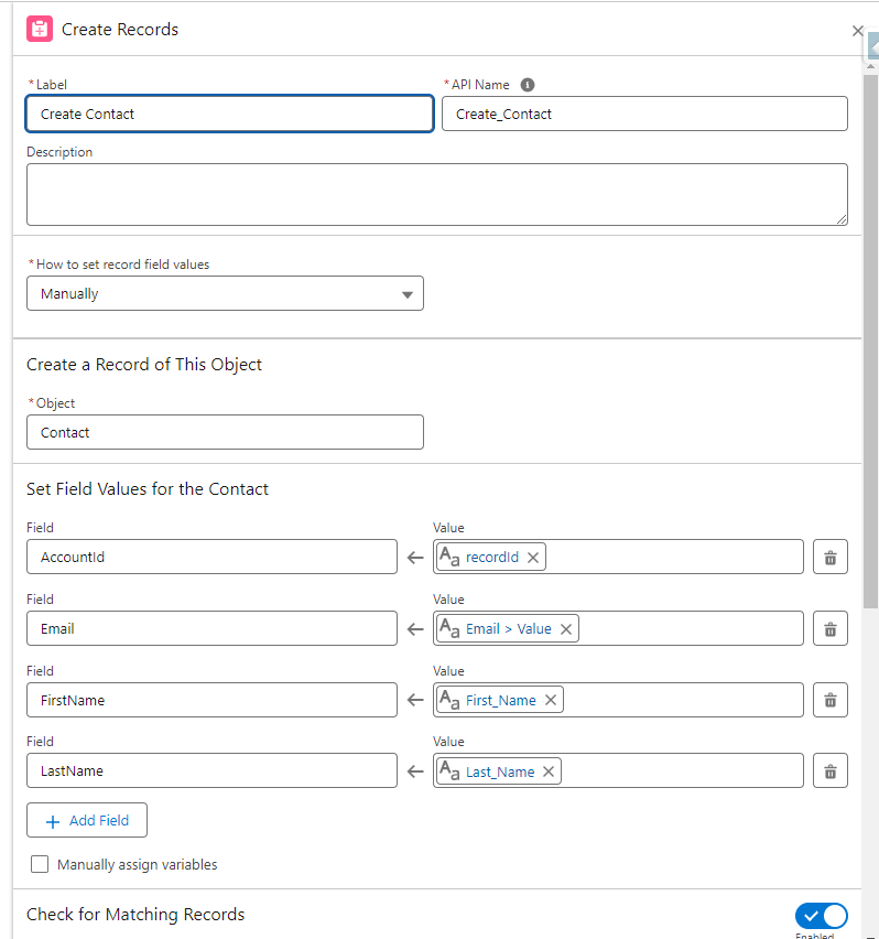 This is the most important part of the process. As mentioned earlier, no matter what type of Flow you choose, simply add the Create Records element to the Flow and enable the “Check for Matching Records” function to make it work.