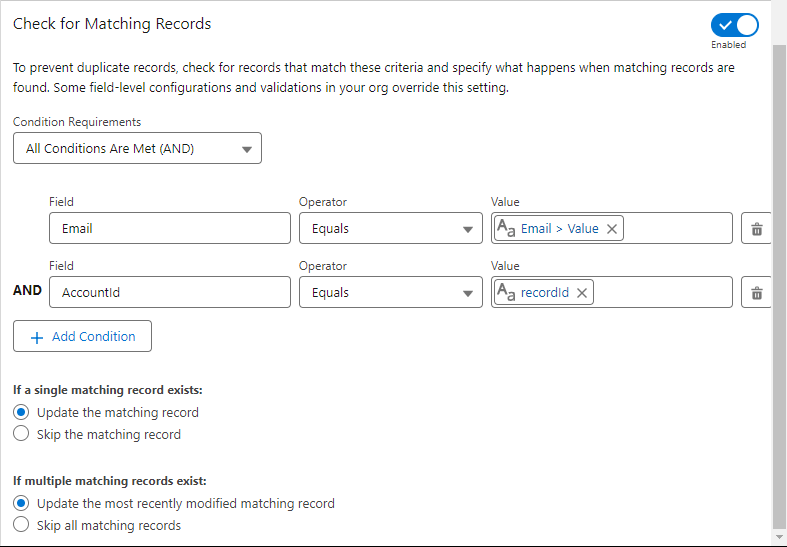First, select the fields that will be checked for duplicate records, such as an email, for example. If a contact record has the same email as an existing contact in Salesforce, a new record will not be created; instead, the existing one will be updated.