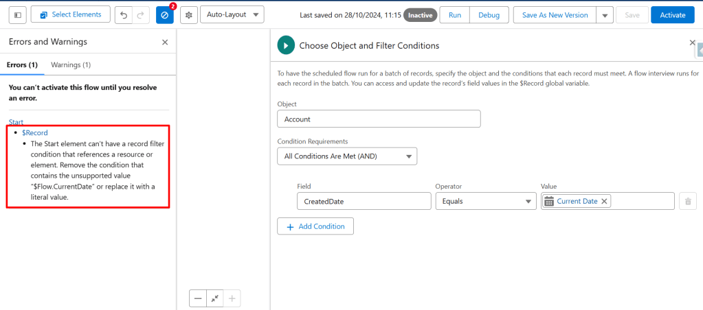 However, upon configuring this condition in the Start element, Salesforce returns an error message:
